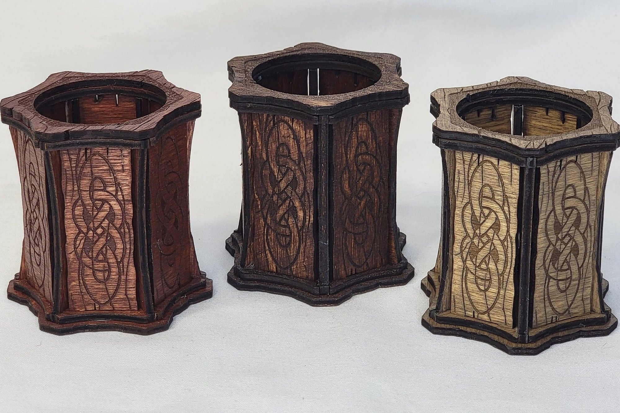 Handcrafted from durable 1/8" Baltic Birch, this octagonal tea light holder is laser-cut with intricate Celtic patterns that spark wonder and invite warmth. Each detail whispers stories of enchanted forests and timeless magic.