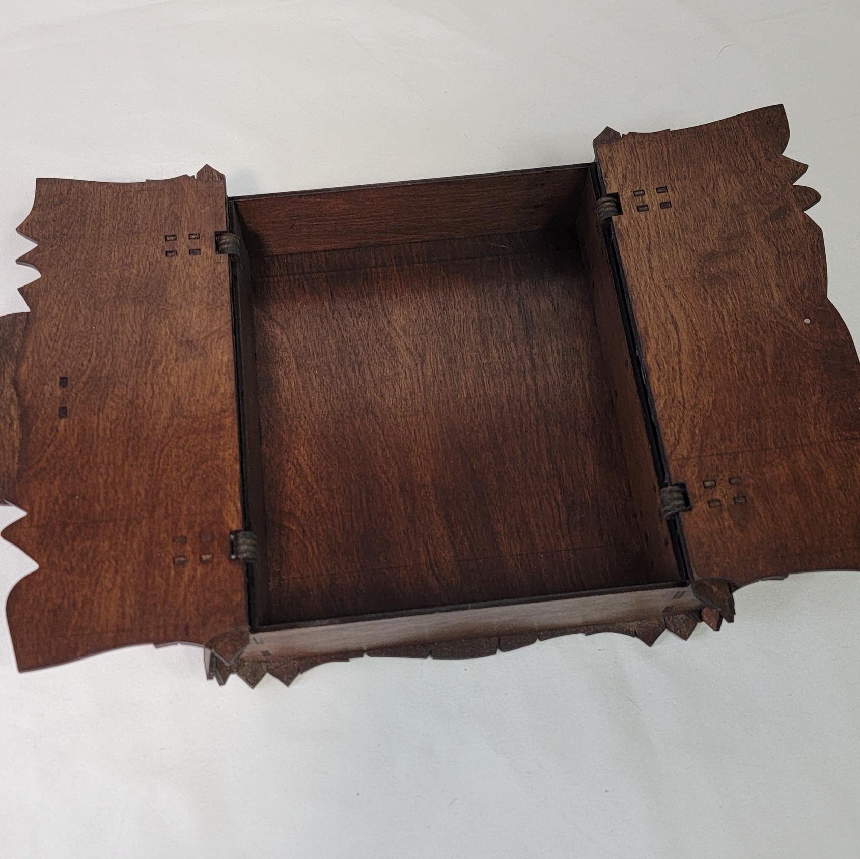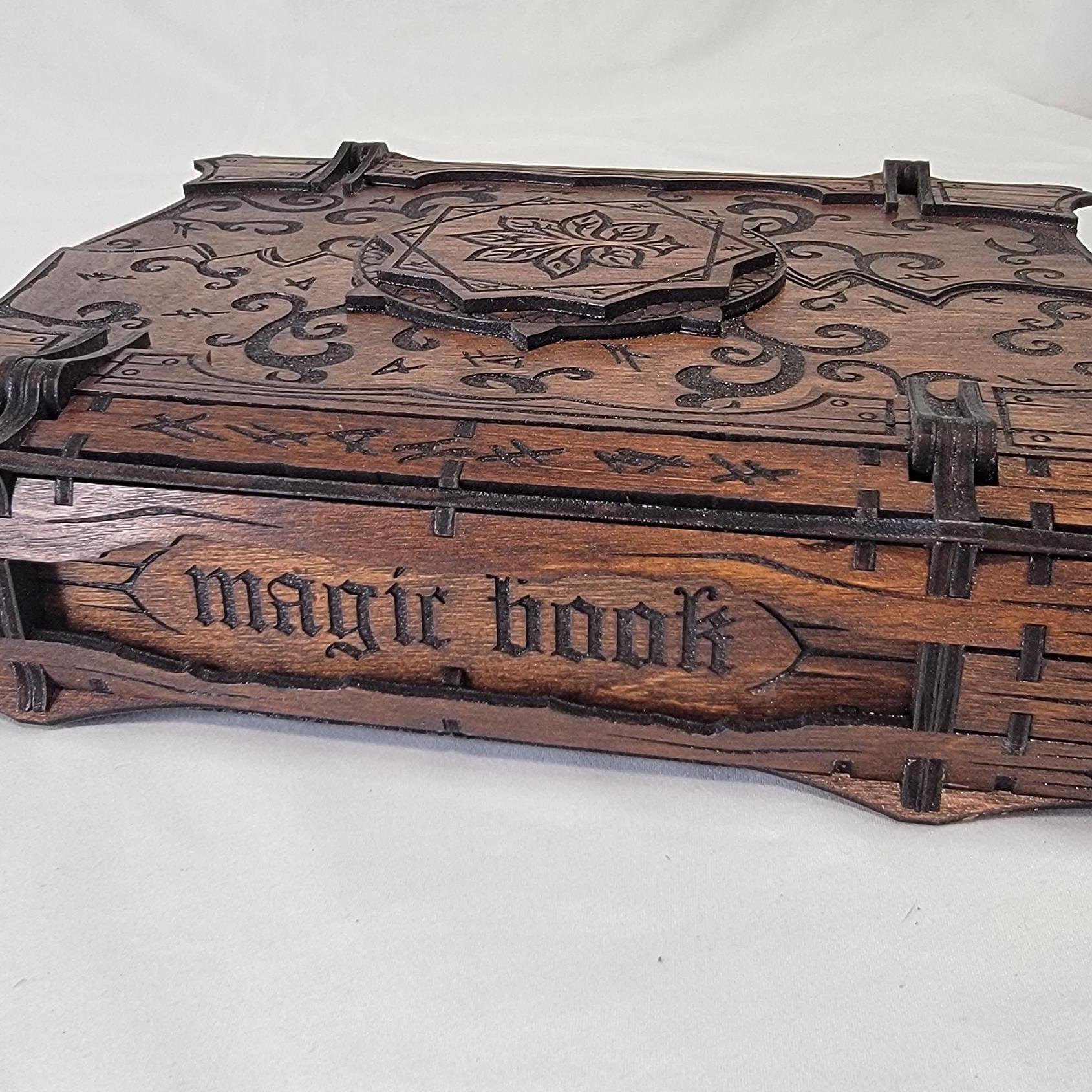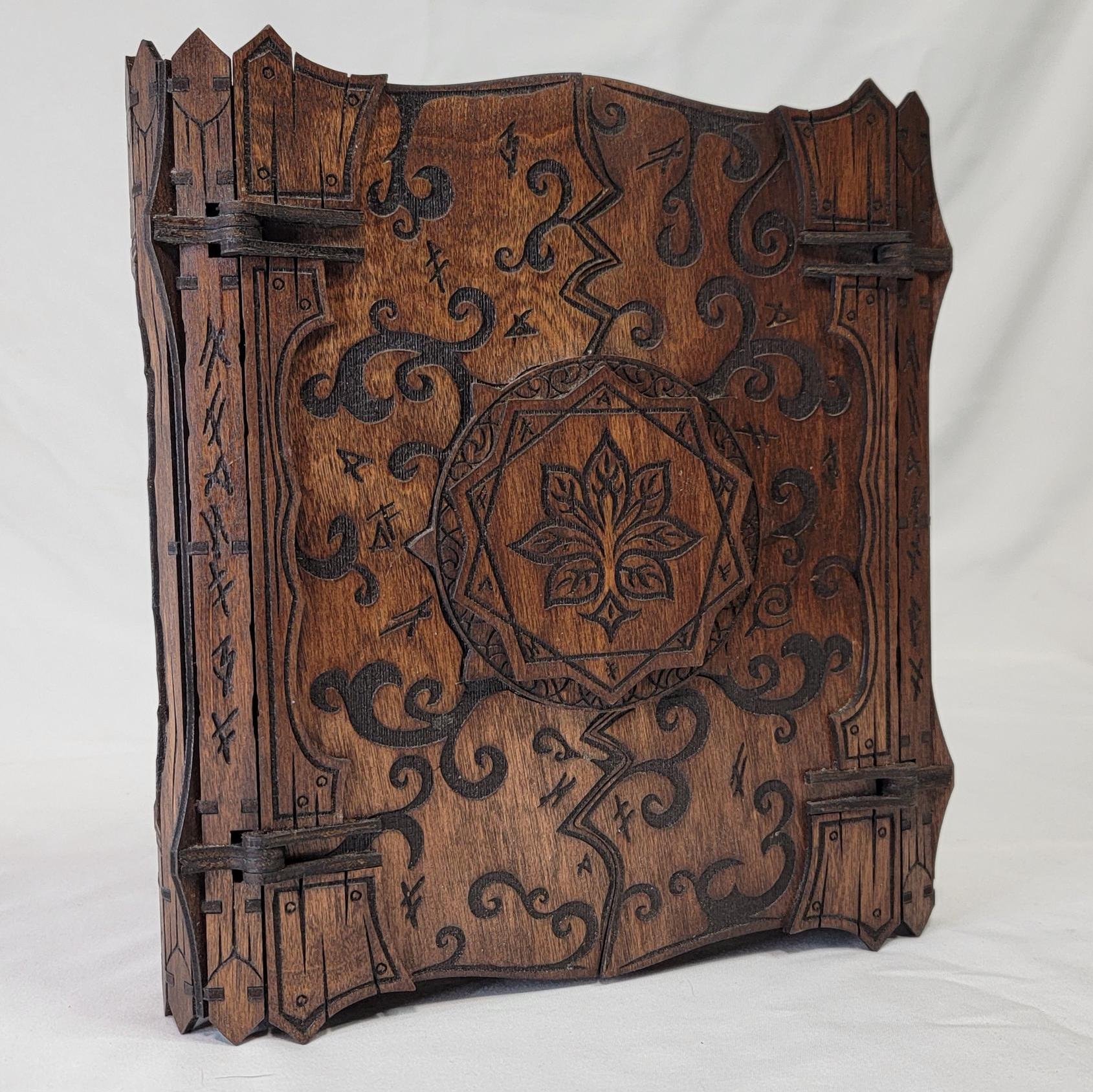 Crafted from sturdy Birch plywood and adorned with floral and arcane engravings, its beauty is matched only by its resilience. A hidden magnetic clasp secures your secrets, ensuring everything within remains protected.