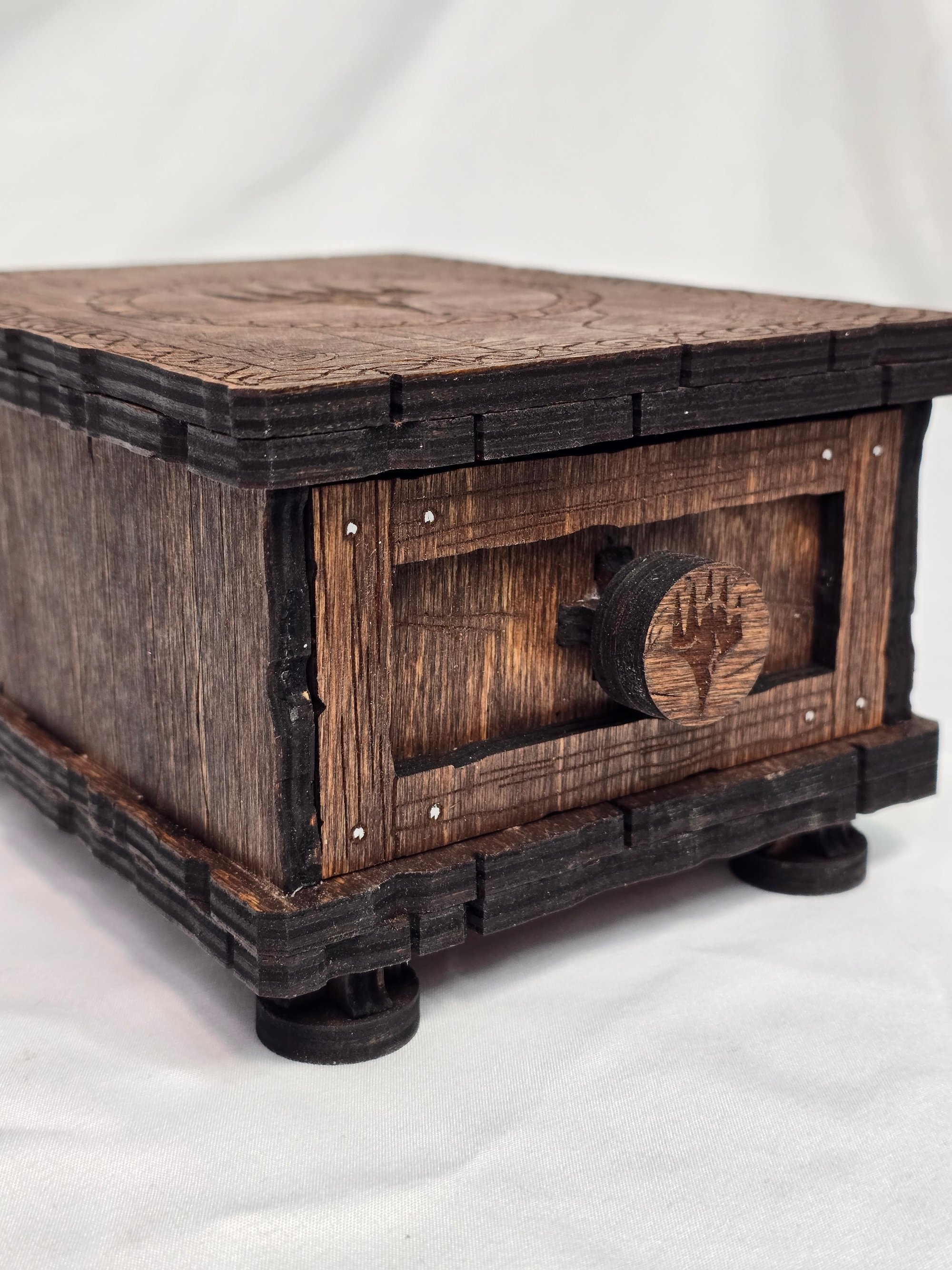 Featuring a single, smooth-gliding pull-out drawer, this handcrafted wonder is perfectly sized for your most prized tarot decks, enchanted dice, delicate trinkets, or magical oddities. Place it on your altar, your gaming table, or nestled within your bookshelf—wherever it rests, it stands as a vigilant guardian, a silent sentinel to your personal arcana.